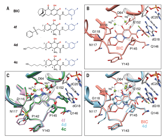 最初观察到的是,药物附着在HIV内含物上与PFV内含物上有何不同。例如,这种被称为4f的化合物在与PFV内含体结合时会向后循环,而在与HIV复合物结合时却保持相对平坦,这可以帮助研究人员改善潜在的未来分子的结合特性。
