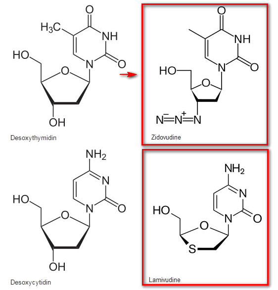 核苷(酸)类似物就是一种结构修饰过的核苷(酸),这种修饰通常对五碳糖进行。比如齐多夫定就是胸腺嘧啶脱氧核苷的修饰,拉米夫定(Lamivudine)就是胞嘧啶脱氧核苷的修饰。下图是它们和对应的核苷的对比图,可以看出它们的结构其实是非常相似的,只是做了一点小小的修改。然而不要小看这小小的修改,背后可能是数十人的努力和数亿美元的研发成本。