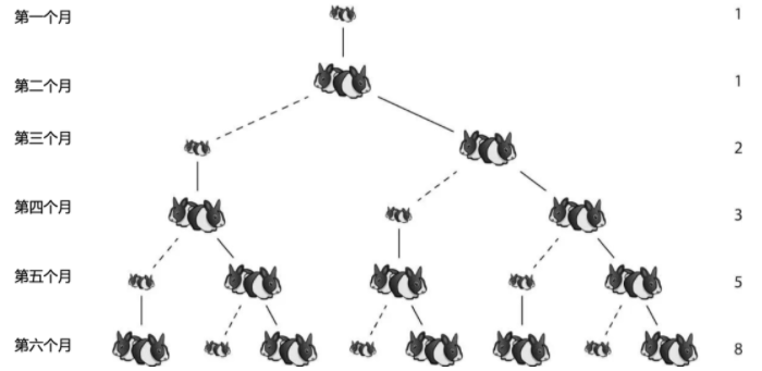 发现以上规律是,每月的兔子对数=上一月的兔子对数+该月新生的兔子对数=上一月的兔子对数+上上月的兔子对数
