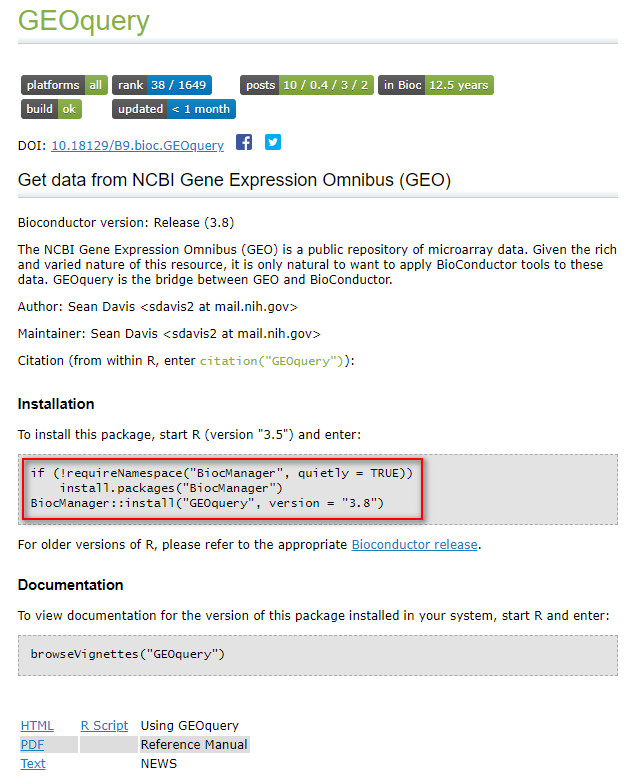 if (!requireNamespace("BiocManager", quietly = TRUE)) install.packages("BiocManager")BiocManager::install("GEOquery", version = "3.8")