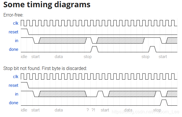需要注意的是最后一步的设计,也就是STOP状态之后的判断,如果输入数据为1,则数据接受结束,给出接受完毕信号done;否则的话,我们不得不等到结束位标志1之后才能进入下一串数据的接收,且一旦进入这种情况,则抛弃这一串数据的接受,也即不会产生接受完毕信号done。