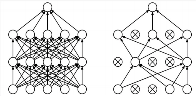 torch.nn.Dropout类用于防止卷积神经网络在训练的过程中发生过拟合,其工作原理简单来说就是在模型训练的过程中,以一定的随机概率将卷积神经网络模型的部分参数归零,以达到减少相邻两层神经连接的目的。下图显示了 Dropout方法的效果。