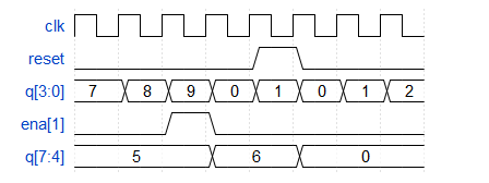 建立一个4位数的BCD(二进制编码的十进制)计数器。 每个十进制数字使用4位编码:q [3:0]是个位,q [7:4]是十位,依此类推。对于数字[3:1],还输出一个使能信号,指示每个高三位应递增。