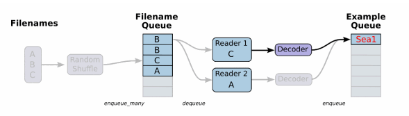 这个QueueRunner工作线程是独立于文件阅读器的线程,因此乱序和将文件名推入到文件名队列这些过程不会阻塞文件阅读器运行。根据你的文件格式,选择对应的文件阅读器,然后将文件名队列提供给阅读器的 read 方法。阅读器的read方法会输出一个键来表征输入的文件和其中纪录(对于调试非常有用),同时得到一个字符串标量,这个字符串标量可以被一个或多个解析器,或者转换操作将其解码为张量并且构造成为样本。
