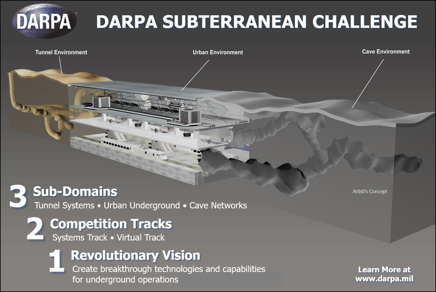这项竞赛是DARPA城市挑战赛和DARPA大挑战赛等一系列机器人挑战赛中的最新一场。最近发生的许多事件,例如泰国的山洞救援,全球范围内的各种采矿灾害以及由于全球气候变化而导致的地下交通线泛滥,都凸显了对可在GPS受限空间内运行的搜救机器人的需求不可用。这项竞赛旨在推动在黑暗,密闭和危险空间中运行的移动机器人的最新技术水平。挑战分为三个单独的比赛,每个比赛都在不同的地下环境(隧道,城市地形和洞穴)中进行。第一阶段的比赛在八月结束,可以在DARPA的博客中阅读所有相关内容。
