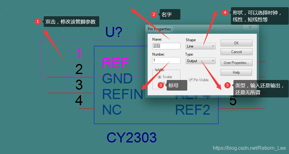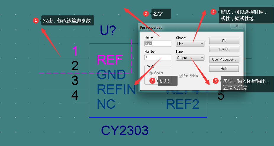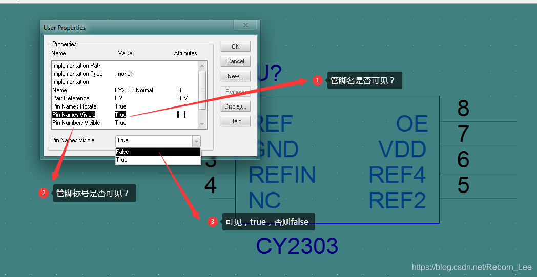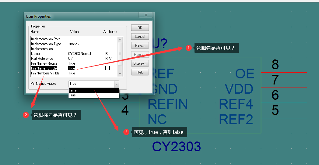 设计好之后,可以通过菜单栏中的Options中的Part Properties,修改管脚名字是否可见,当管脚名字无所谓时,可以选择不可见等: