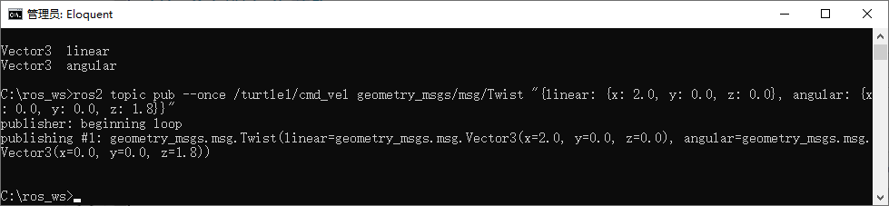 ros2 topic pub --once /turtle1/cmd_vel geometry_msgs/msg/Twist "{linear: {x: 2.0, y: 0.0, z: 0.0}, angular: {x: 0.0, y: 0.0, z: 1.8}}"