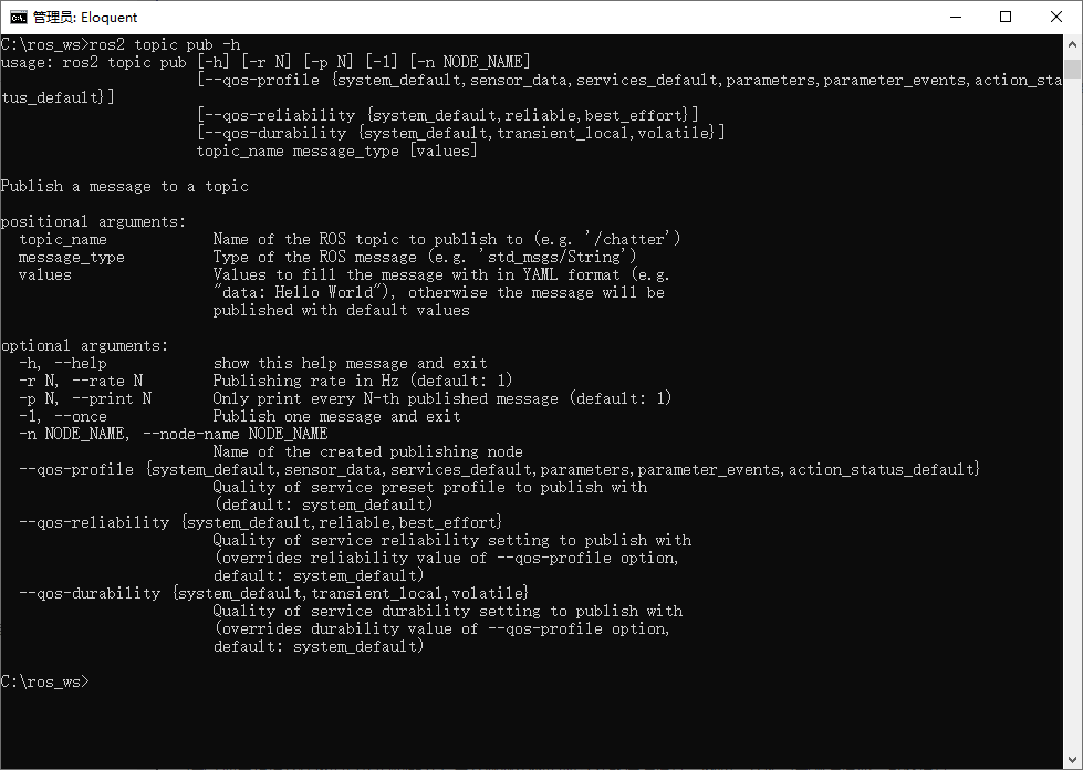 ros2 topic pub <topic_name> <msg_type> "<args>"