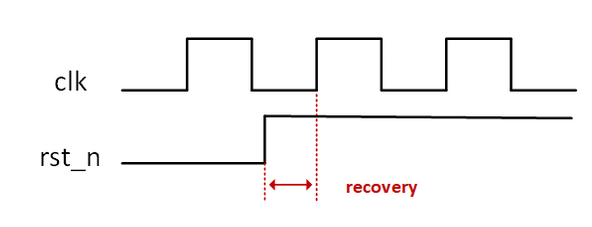 如上图所示,恢复时间就是异步复位信号撤离(无效)时刻与下一个时钟有效沿之间的时间,也就是复位信号必须在时钟有效沿到来之前的一段时间撤离,这样才能保证触发器有足够的时间恢复到非复位状态。如果违反了恢复时间,则会导致触发器输出出现亚稳态。