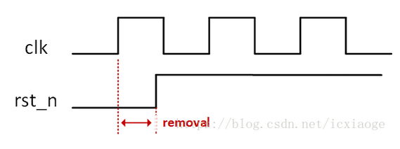 如上图,在时钟有效沿来临之后复位信号还需要保持的时间为去除时间removal time(去除时间);