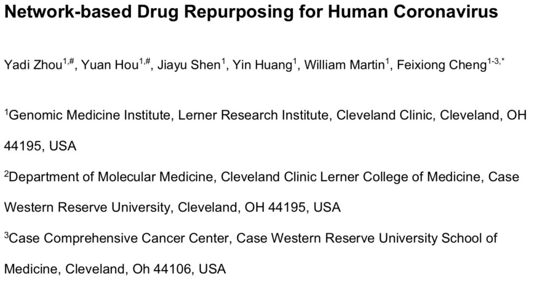 Yadi Zhou et al. Network-based Drug Repurposing for Human Coronavirus. https://www.medrxiv.org/content/10.1101/2020.02.03.20020263v1