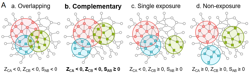 抗病毒治疗中常常采用药物组合疗法。作者尝试通过网络分析推荐HCoVs治疗中能产生协同效应的药物组合。作者定义了一种具有“互补(Complementary)”模式的药物组合方式(图5A_b):两种药物的靶标都覆盖到HCoV模块,但两种药物不会互相重叠。对于图5A_a所示的情况,两种药物虽然能很好的覆盖HCoV模块,对HCoV有很好的治疗作用,但是两个药物互相重叠,容易发生严重的副作用。