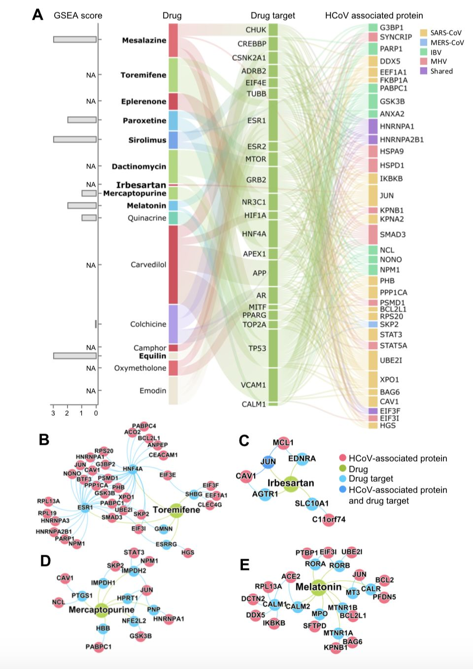图4. 药物-靶标-HCoV宿主蛋白网络