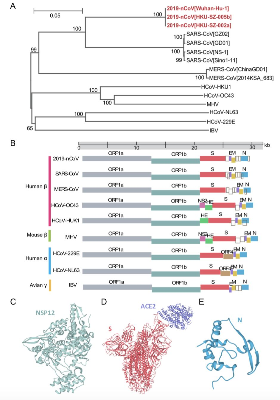图2A和2B展示了现今已经发现的7种致病性冠状病毒(HCoV)的进化关系:2019-nCoV与SARS-CoV在已知的其他6种HCoV中显示出最高的~80%的核苷酸序列同一性,揭示了2019-nCoV与SARS-CoV之间的保守进化关系。