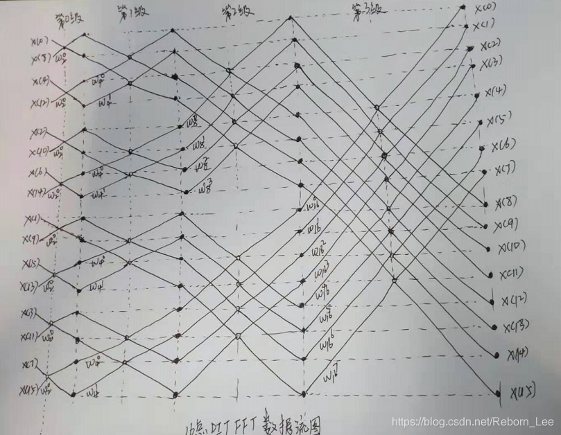 ,从DIT FFT的数据流图可以看出,第0级蝶形运算的旋转因子为