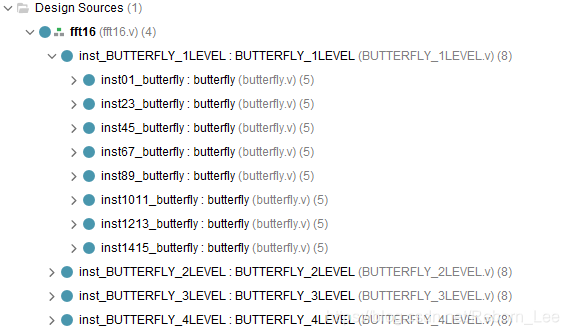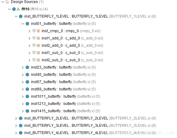 我们对这个16点并行FFT算法进行描述的时候,采用的结构是从层层例化,从该算法的最顶层fft16,到4级蝶形运算,以及每级蝶形运算包含的8个蝶形单元,在到蝶形单元里面的复数乘法,加法器,减法器等等。从顶层开始描述到最底层,到达最底层,其实只用到了一个复数乘法器,一个加法器,一个减法器。蝶形因此采用参数的方式进行传递。
