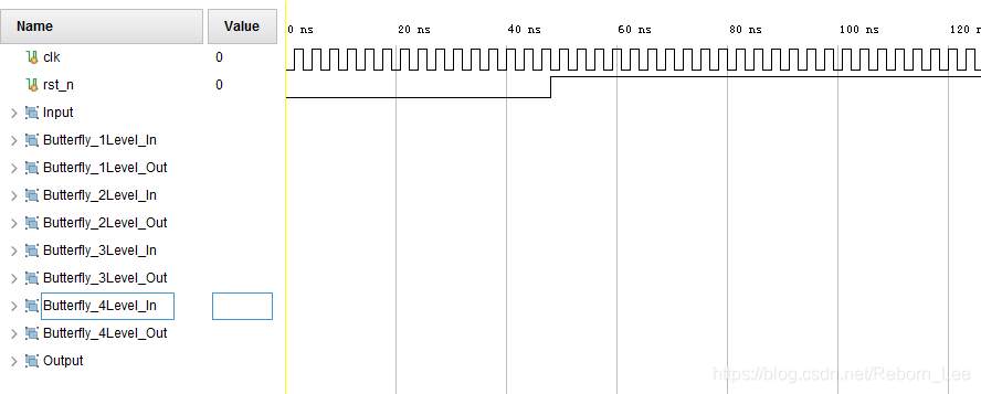 易错点在于仿真时候如何给第一级蝶形运算输入数据,注意第一级蝶形运算的数据并不是顺序排列,而是有一定的规律。