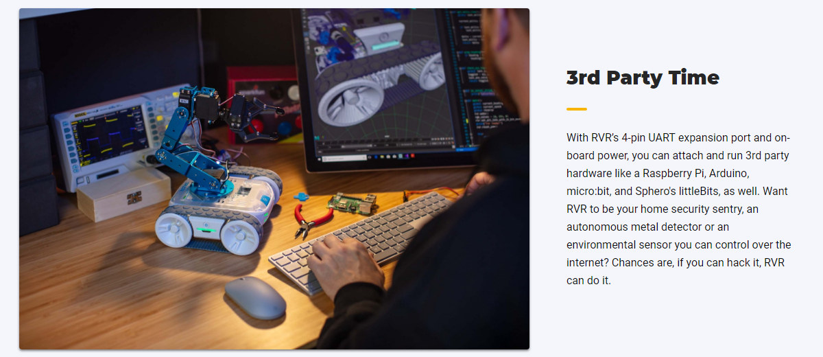 借助RVR的4针UART扩展端口和板载电源,还可以连接并运行第三方硬件,例如Raspberry Pi,Arduino,micro:bit和Sphero的littleBits。希望RVR成为可以通过互联网控制的家庭安全岗哨,自主金属探测器或环境传感器吗?