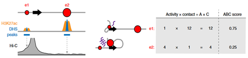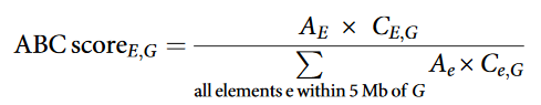 目前已有基于增强子与目标基因的方法、基于基因组三维特征的方法和基于表观基因组特征的机器学习方法用于预测增强子和目标基因之间的功能性连接,其表现均不尽人意。Fulco团队提出了ABC模型,该模型基于简单的生物化学概念:一种远端候选元素对目标基因的定量影响应该取决于它作为增强子的活性(Activity),加权于它与目标基因启动子的3D接触频率(Contact);一个远端候选元素对目标基因表达的相对贡献应该取决于该元素的定量影响除以所有元素的总定量影响。在这个概念下,得到远端候选元素E对目标基因G的相对贡献值公式: