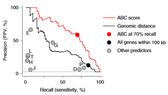 作者还比较了基于ABC阈值的二元分类模型和其他增强子-基因调控预测模型的召回率,精确度和AUPRC,结果表明ABC模型性能极佳,AUPRC达0.65,优于其他预测模型,如图6。此外,ABC模型也优于单独使用A或C的模型(AUPRC分别为0.22和0.29)。