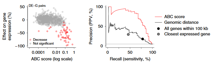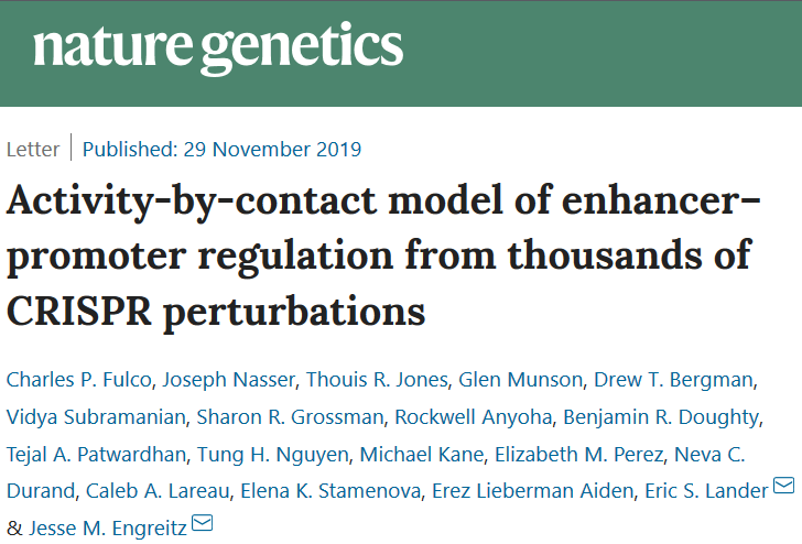 Fulco, C.P., Nasser, J., Jones, T.R. et al. Activity-by-contact model of enhancer–promoter regulation from thousands of CRISPR perturbations. Nat Genet 51, 1664–1669 (2019) doi:10.1038/s41588-019-0538-0