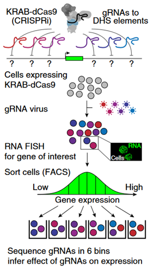 gRNA病毒引导KRAB-dCas9进入细胞抑制候选增强子的表达并为细胞着色。同时对一个细胞群落的多个细胞进行实验,每个细胞至多能与一个gRNA结合。