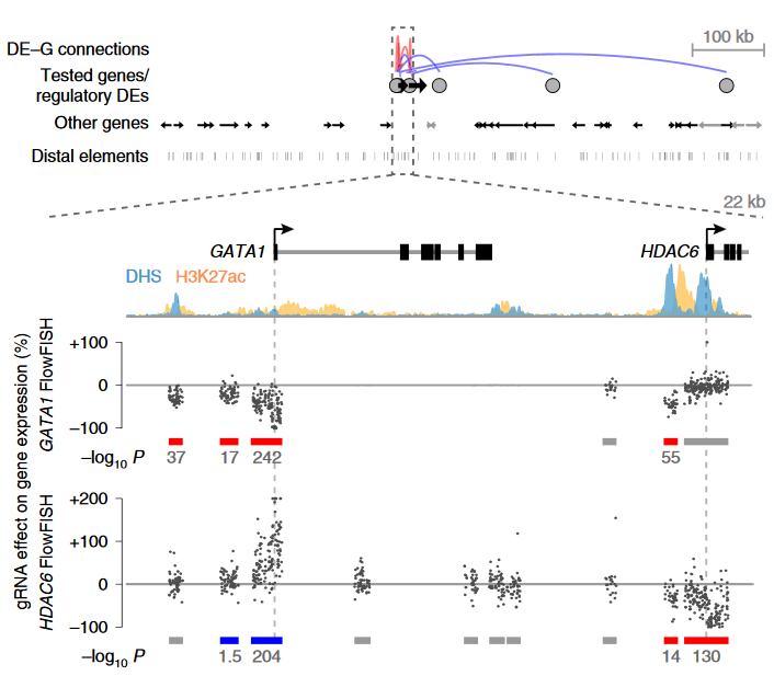 Fulco团队对K562人类白血病细胞进行实验,反复实验中对每个候选元素的计算出的量化影响具有高度相关性,皮尔森相关系数达0.94且CRISPRi-FlowFISH计算得到的量化影响满足逆转录定量PCR的测量,皮尔森相关系数达0.81。此外,在对GATA1的实验中,识别出三个之前已确定的候选元素。图3展示了CRISPRi-FlowFISH对目标基因GATA1与HDAC6对应调控元素的识别。计算得到的对目标基因表达有促进或抑制作用的远端候选元素正好对应核苷酸序列中DHS和H3K27ac值的波峰位置。