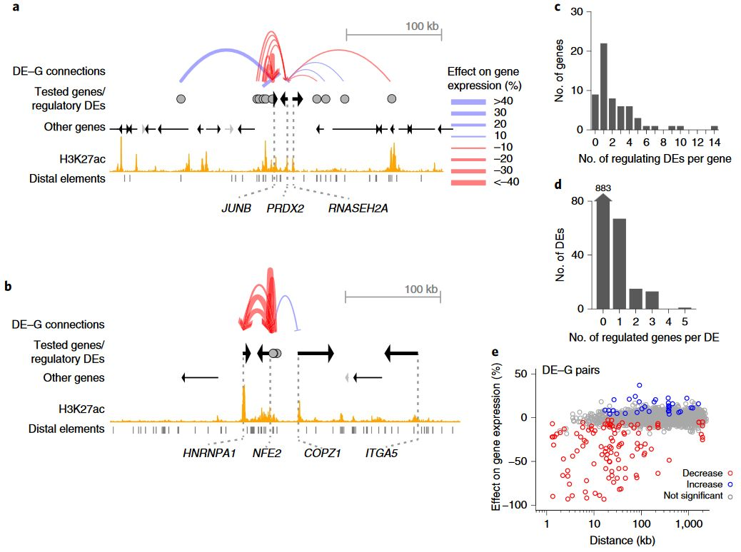 在对全基因组进行调控元素和目标基因的CRISPRi-FlowFISH映射后,实验结果表明一个增强子可以调控多达五个目标基因、一个目标基因可以被多达十四个远端候选元素调控、部分增强子会跳过近端的基因而调控远端的基因、调控元素与目标基因之间的距离大多小于100kb,这些符合其他实验方法的结果。此外,在测试的3863个远端候选元素-目标基因对中,141对涉及重要基因表达的识别错误率低于0.05。