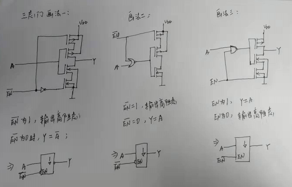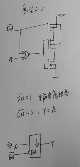 3、画出CMOS三态缓冲器的电路原理图,解释一下高阻态。