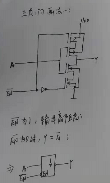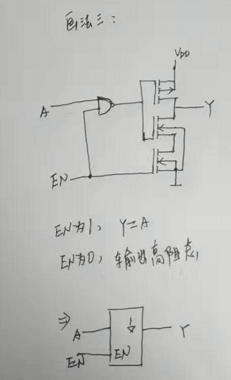 为1时,最上面的PMOS截止,下面的NMOS也截止,所以输出为高阻态;当