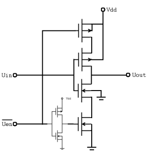 第一个画法:在反相器的上方串联一个PMOS,在下面串联一个NMOS,如下图画法一: