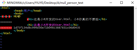 于是小A去pull,发现了出现CONFLICT (content): Merge conflict in user.html,这个的意思就是内容冲突,