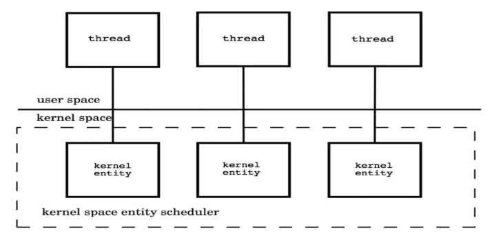 内核级别线程:一对一模型(1 : 1):每个用户级线程映射到一个内核级线程。优点是缓存读写快速,缺点是容易阻塞。