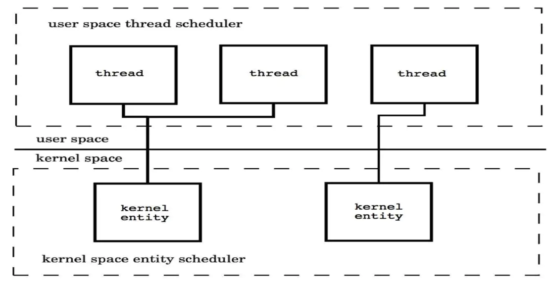 混合线程:多对多模型(M : N):内核线程和用户线程的数量比为 M : N,综合了前两种的优点