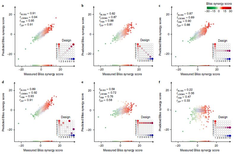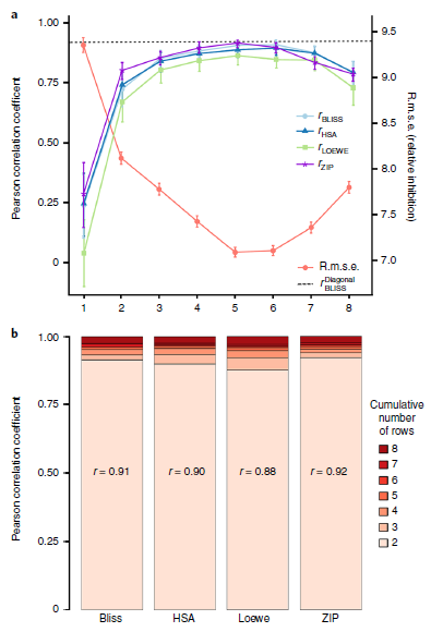 使用Bliss、Loewe、HSA或ZIP模型,通过计算预测和预期协同作用得分之间的Pearson相关系数,评估协同作用检测的预测准确性。用r.m.s.e.评估剂量组合模式的预测准确性。