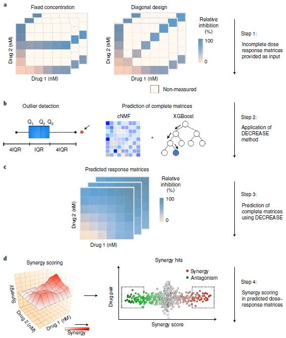 DECREASE预测方法主要由两阶段构成:(1)对有限的测量实验设计(如固定浓度或对角设计)获得的稀疏矩阵进行离群值检测;(2)使用cNMF算法预测完全剂量反应矩阵。最后,通过任意一种协同模型识别最好的协同药物组合。