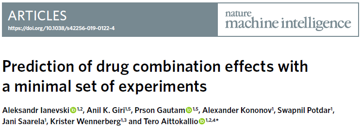 Ianevski, A., Giri, A.K., Gautam, P. et al. Prediction of drug combination effects with a minimal set of experiments. Nat Mach Intell 1, 568–577 (2019) doi:10.1038/s42256-019-0122-4