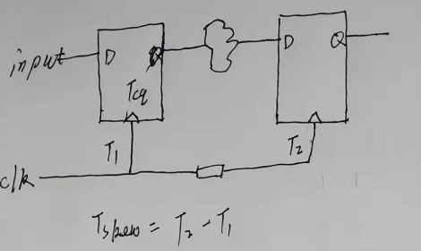 如上图是正时钟偏斜,但是推理出来的公式都是一样的,这个时钟偏斜会改善时序,貌似让时钟周期的更大了,这样更有利于建立时间的满足。