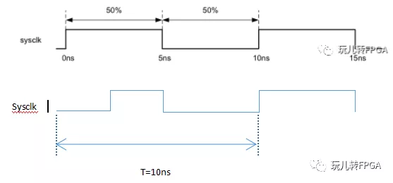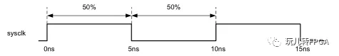 create_clock -name clk -period 10 [get_ports sysclk],这句xdc命令告诉编译器,时钟clk,从sysclk(get ports 后面摄取的是顶层要分配引脚的物理引脚,get pins后面摄取的是生成的某个寄存器或者器件的引脚,get nets摄取的是里面生成的某根线)这个引脚输入,时钟周期是10ns,由于相位和占空比未声明,所以初相位为0,占空比为50%。如下图: