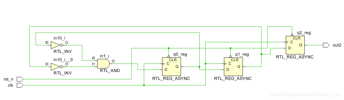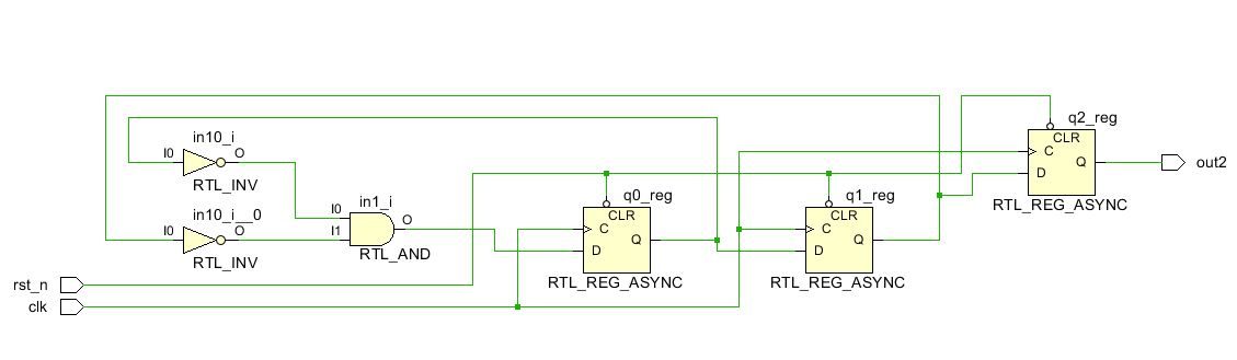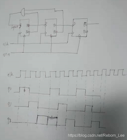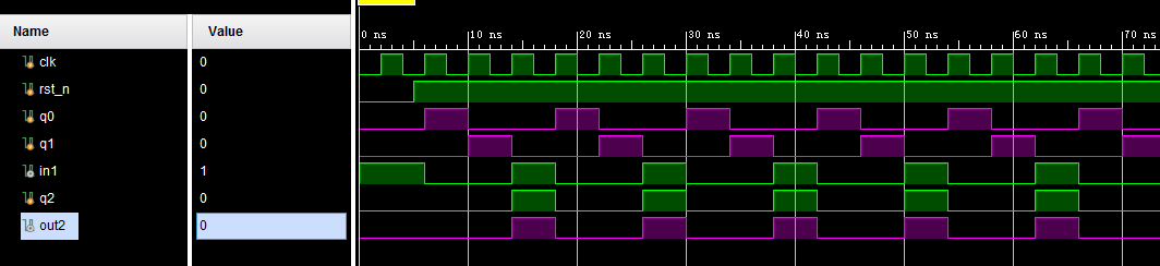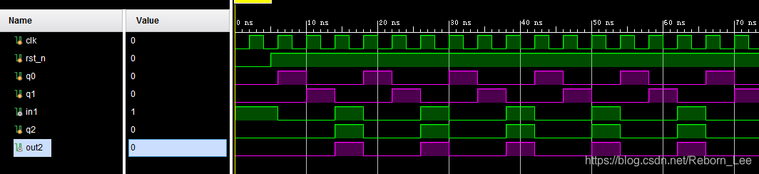 那么当正常运行(复位无效)时,q0的第一个值为复位值延迟一拍并持续一个时钟,之后q1、q2就简单了。