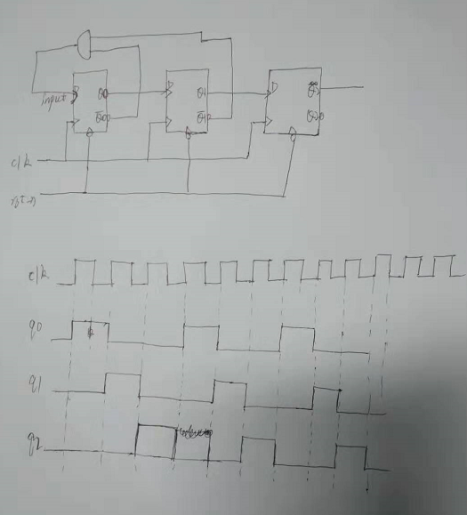 可想想和输入初值有个毛线关系呀,第一个触发器的输入是第二个以及第三个触发器的输出的反馈,是Q1与Q2的或非;