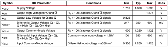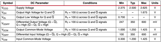 LVDS_25的直流特性如下表所示。