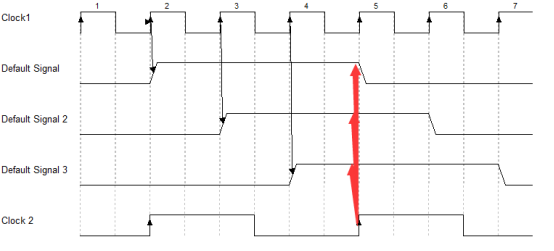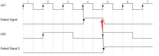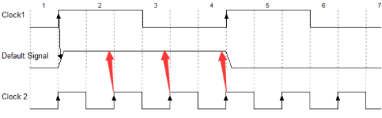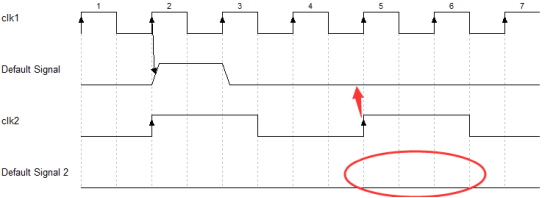 在第2个时钟沿发送信号的时候,只持续了一个时钟周期,因此clk2捕捉不到(这样就是功能性错误了,不单单是时序上的亚稳态而已了);只有在第4个时钟沿的时候发送控制信号,clk2才捕捉得到。因此我们就需要把这个控制信号的周期延迟到clk1周期的3倍,这个可以通过计数器或者状态机进行实现,延长后的波形如下所示: