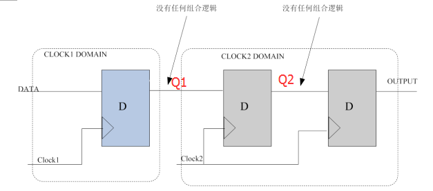 在相位小的地方,建立时间不足,引起了亚稳态,这时候就要上我们的同步器了,这里隆重推出我们的同步器——双D触发器,其电路图如下所示:
