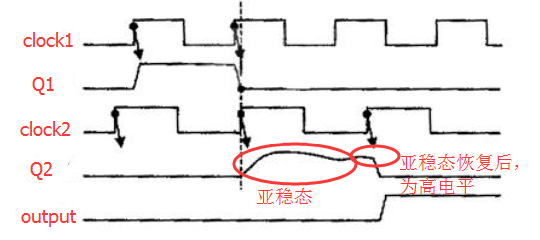 从慢时钟到时钟的波形就不画了, 但是主要符合两个时钟(无论是快到慢还是慢到快)存在最小相位差,且最小相位差大于t,就不会违反建立时间和保持时间,基本不会产生亚稳态。因此在这种情况下,是不需要同步器的。