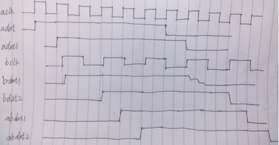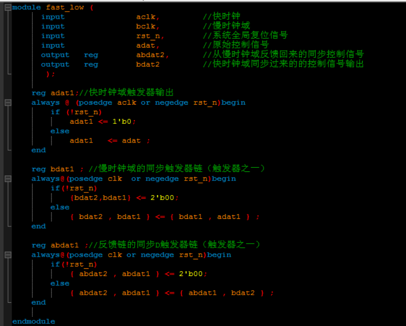 其实原理很简单,当控制信号变高时(adat与adat1),慢时钟域的触发器链(bdat1和bdat2)进行采样,采样得到的高电平(bdat2)后,也就是确认采样得到控制信号后,再通过触发器链反馈给快时钟域(abdat1和abdat2),让快时钟域把控制信号拉低(拉低的或者处理时长在后面有电路),就完成控制信号的正确跨时钟传输。本来不想写代码了的,毕竟有电路了,但是想想还是贴一下代码吧,毕竟最近整理过程中都没有写代码了,感觉有点生疏了,代码如下(如果有错请指出):