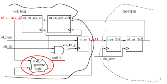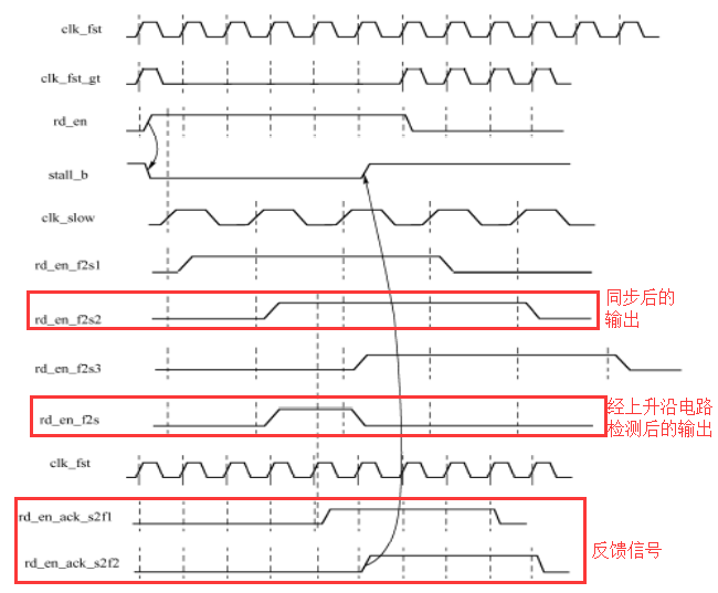 这里通过让快时钟域触发器(特指rd_en触发器)的时钟停止工作的方式,让控制信号保持一定的时间。时钟停止之后,rd_en触发器的输出就会保持不变,等到反馈信号回来,告知慢时钟域采样得到高电平后,再恢复快时钟域的时钟,波形如下所示: