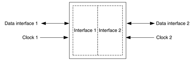 假如设计中所有的触发器都使用一个全局网络,比如FPGA的主时钟输入,那么我们说这个设计只有一个时钟域。假如设计有两个输入时钟,如图1所示,一个时钟给接口1使用,另一给接口2使用,那么我们说这个设计中有两个时钟域。