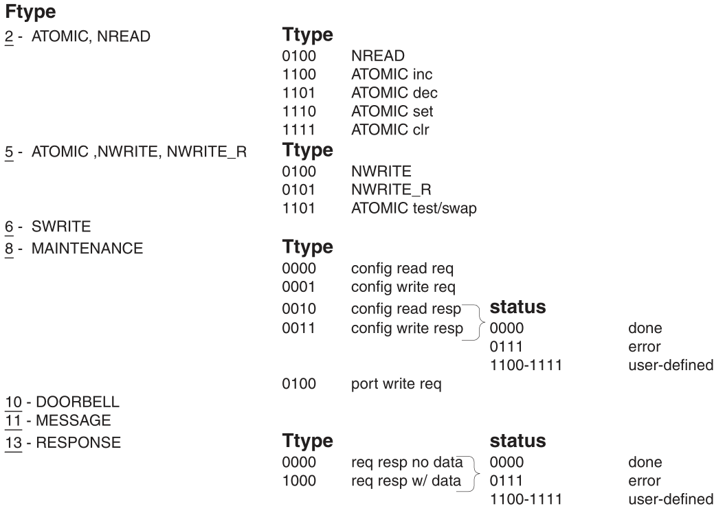 13为响应事物类型,也即专门用来传输响应事物的响应事物包。例如发送NWRITE_R写事物,接收方就需要产生一个响应事物,而最终响应事物的格式通过高速串口发送出去的格式就是这种格式。