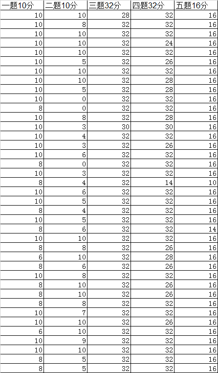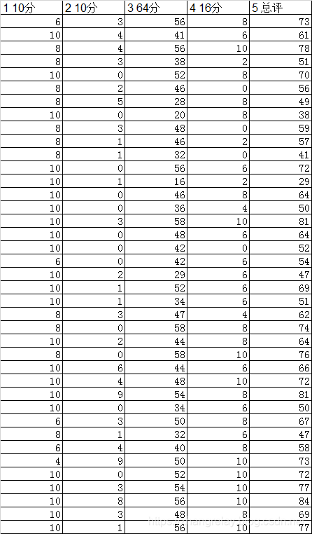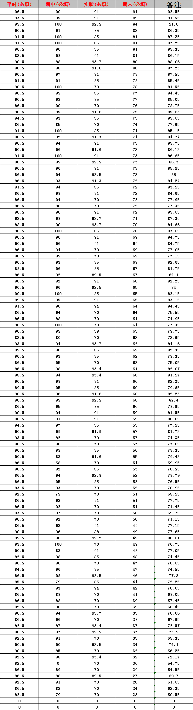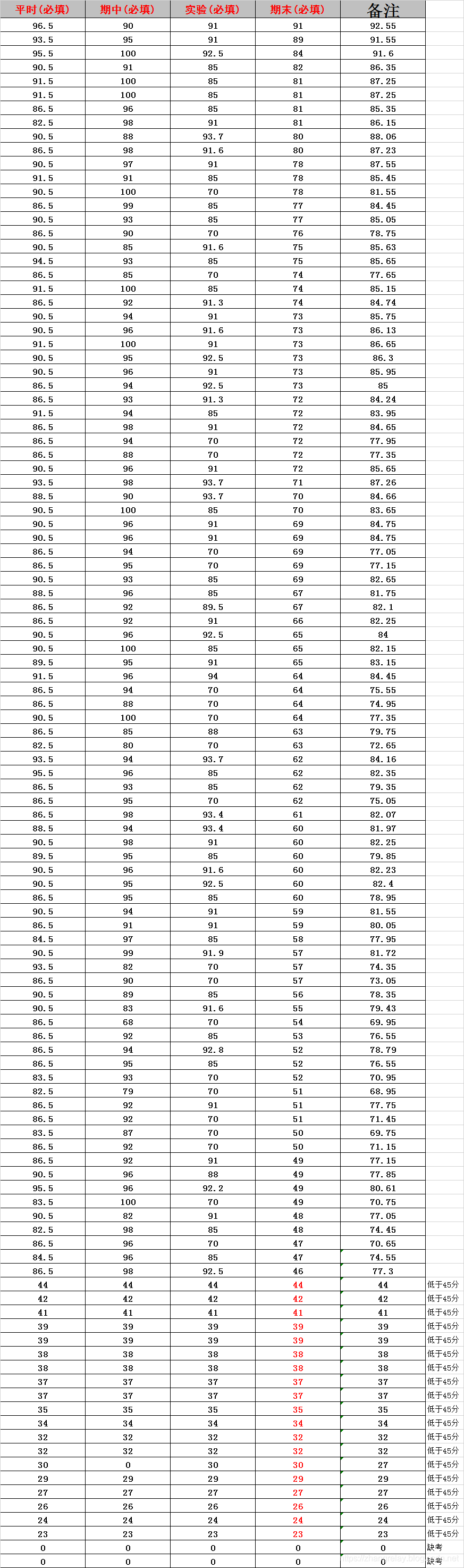 原始成绩汇总后列表(保护学生隐私,成绩乱序,无姓名学号):